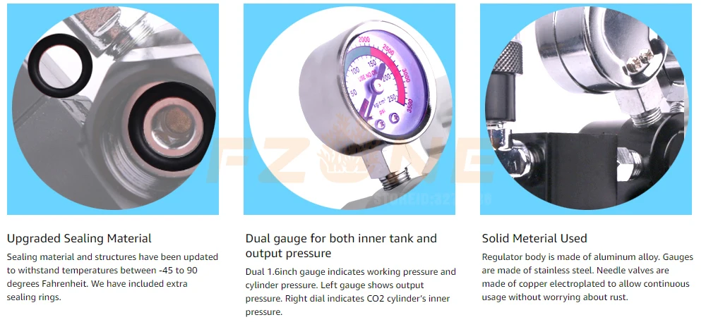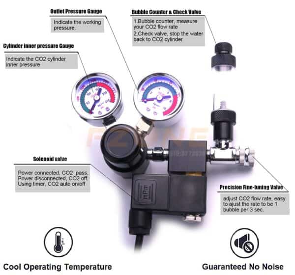 This is a high-quality CO2 regulator with a bubble counter. The body is made of aluminum alloy, with stainless steel gauges and copper electroplated needle valves. It’s one of the most durable units available, and it can withstand extreme temperatures.