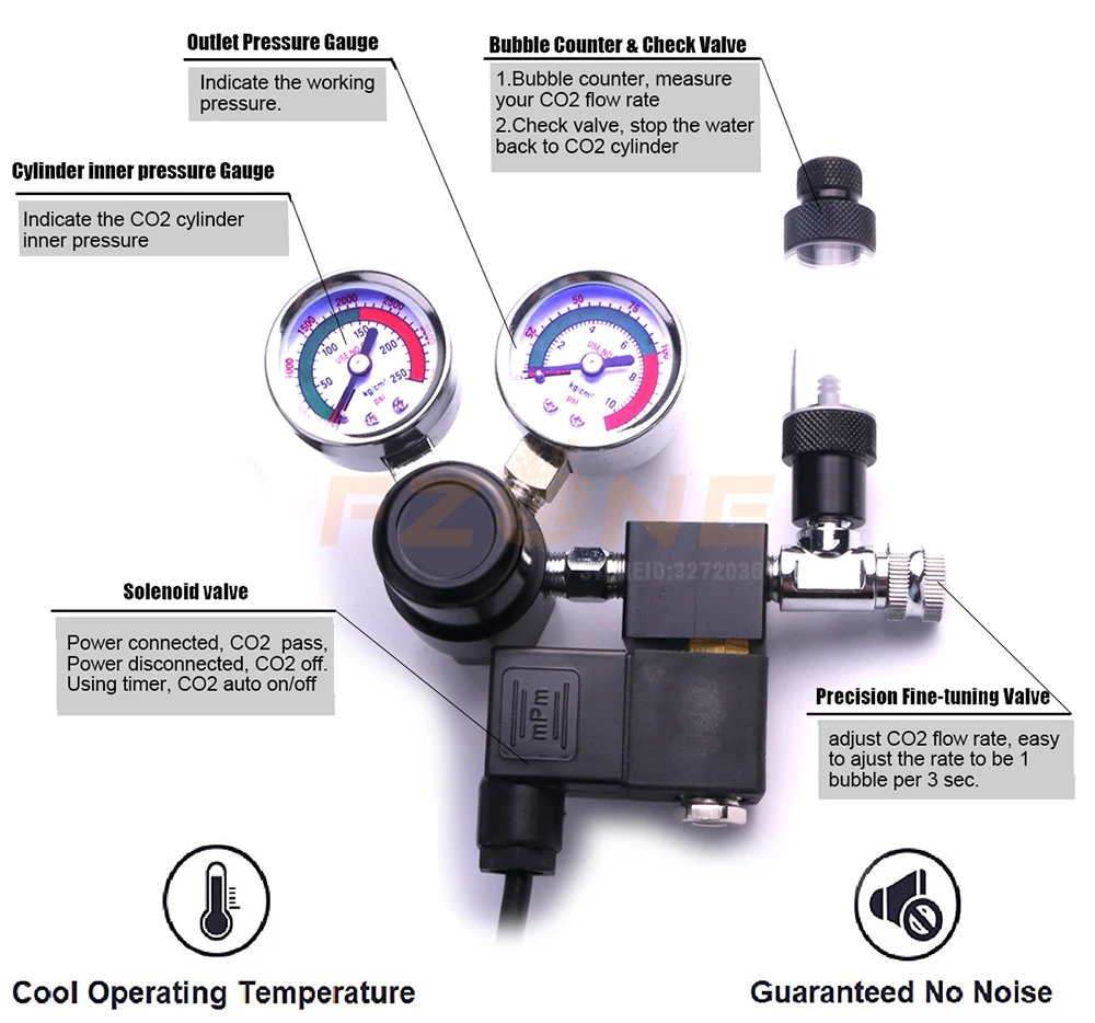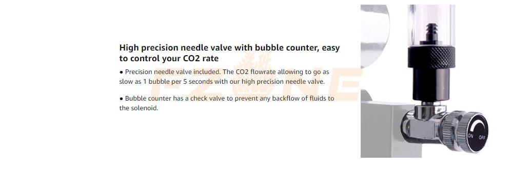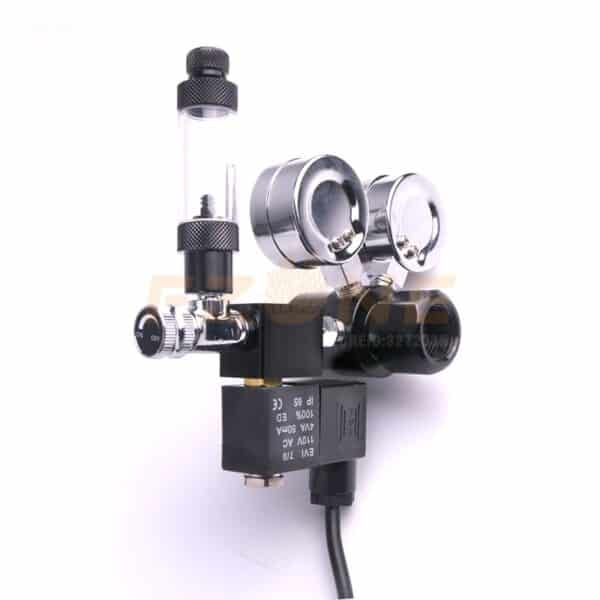 The high-precision needle valve includes a bubble valve. It is so precise that you can set it to go as low as just one bubble every five seconds. To help prevent any backflow from occurring, it also includes a check valve to protect the solenoid.